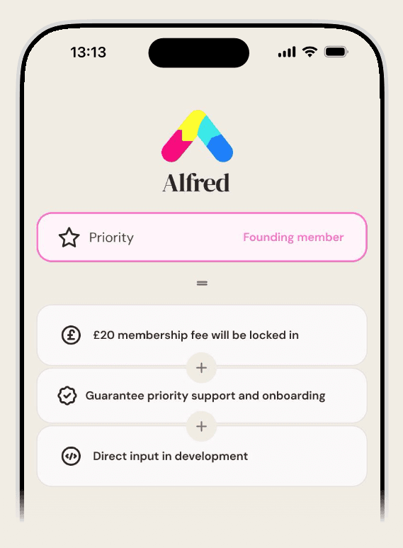 So if that sounds like you, become a founding member. You’ll help us build a fairer model and, if you’d like to, you can have direct input in Alfred’s development too. As a thank you for joining early, we'll guarantee priority support and onboarding and your £20 membership fee will be locked in for as long as you stay with us.